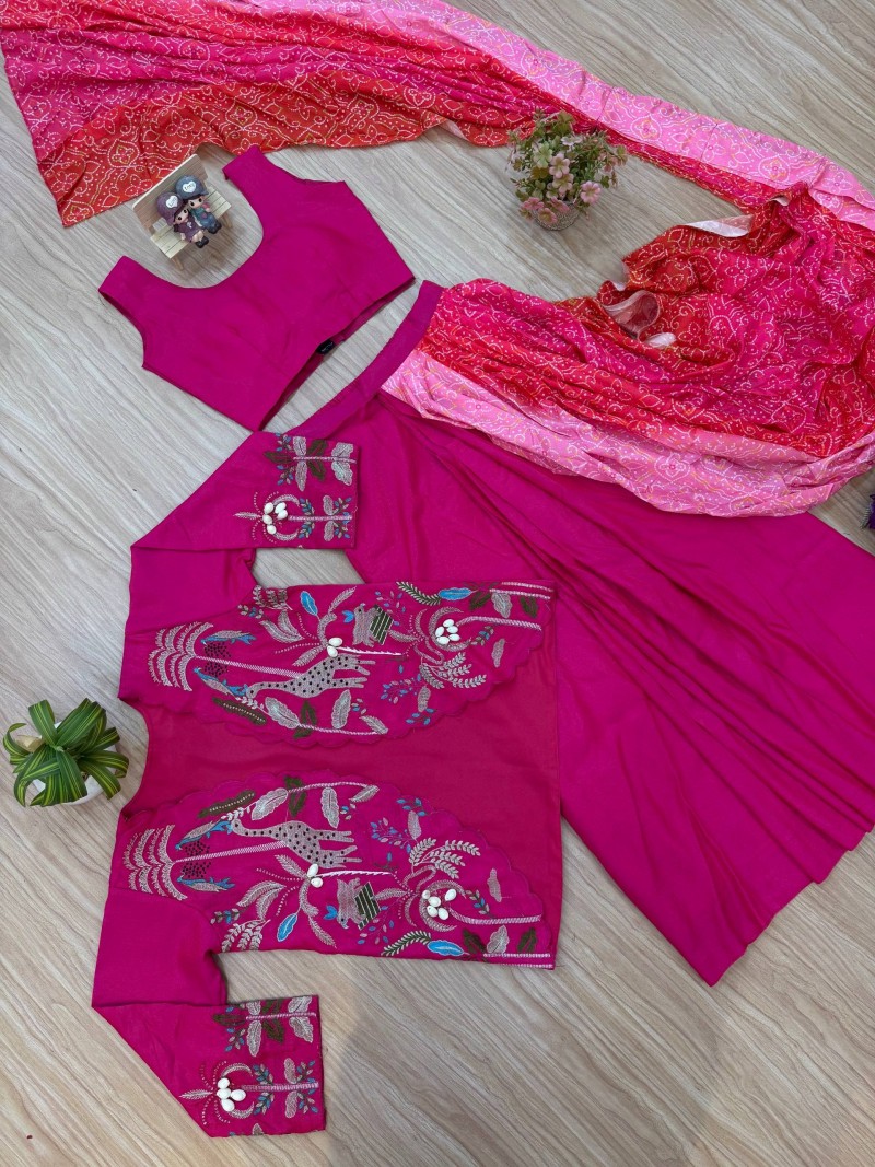 Crafted from premium Shimmer fabric, this pre-stitched drape saree features a trendy Lehenga-Saree design. The pallu comes with a beautiful Bandhani print, adding a touch of traditional charm, and measures 2.5 meters with a cut pallu for a graceful flow. The shimmer fabric provides a rich sheen that lights up the room.