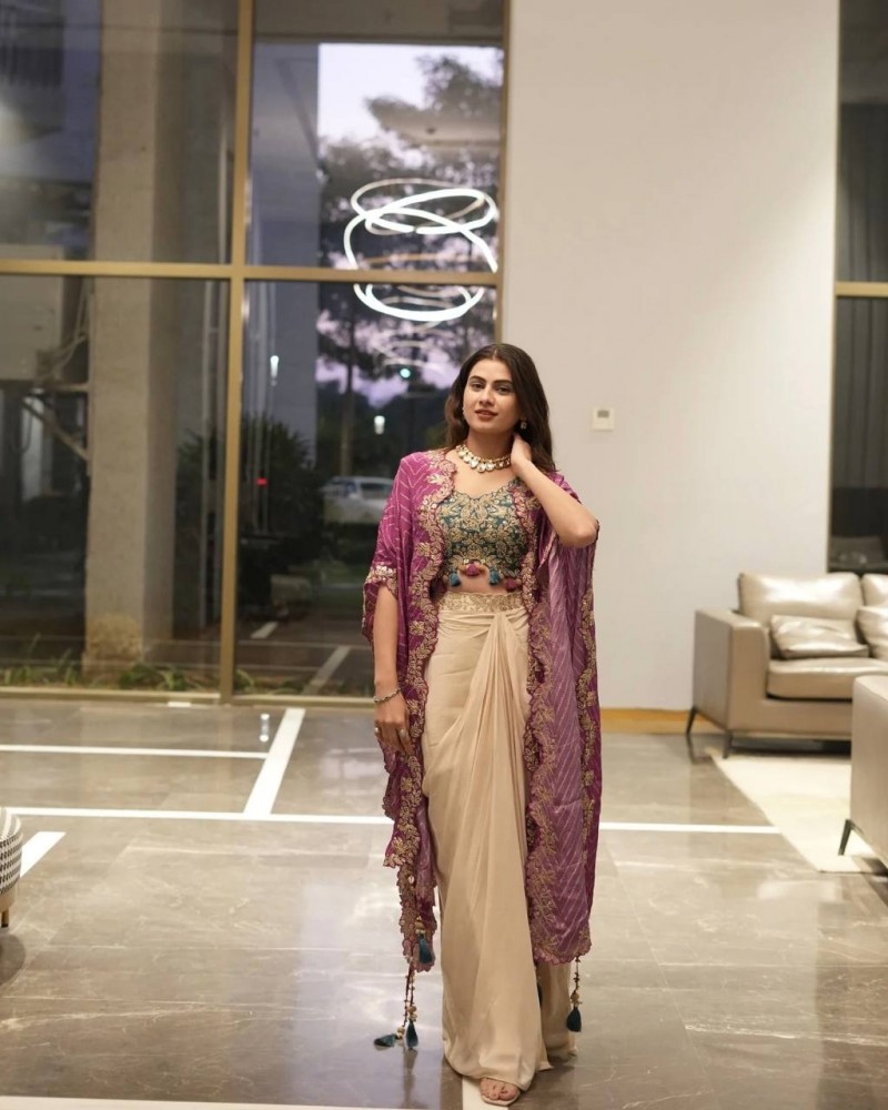 - Dhoti: Made of soft crepe silk, it is paired with a sequin?stitched belt and measures 42?inches, offering graceful drape and a flattering free fit.