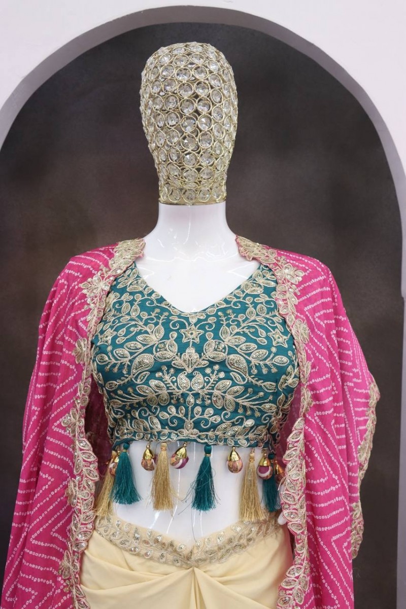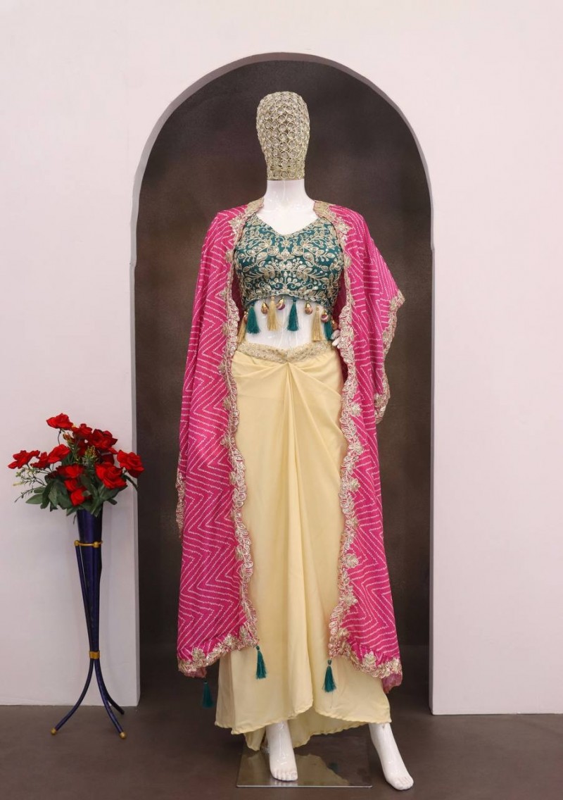 Elevate your wedding season wardrobe with the BB?48 three?piece western ensemble from Shiv?Shakti Boutique, Surat. This eye?catching set includes a sequin?embellished blouse, a flowing crepe silk dhoti, and a statement shrug, all designed for modern women who love a fusion of tradition and trend.